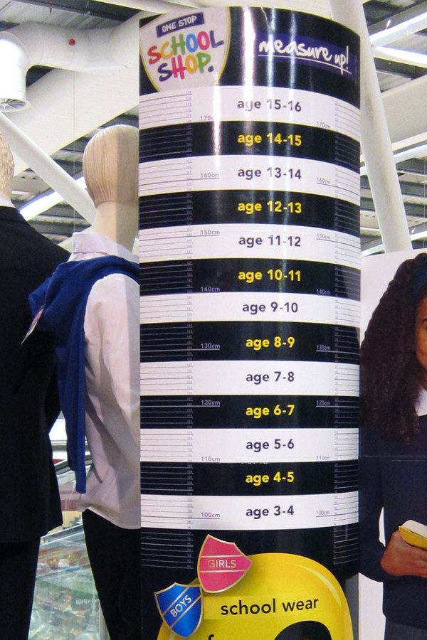 Following metrication, children’s wear labelling continued size markings based on age and height, and, in the case of baby wear, weight.