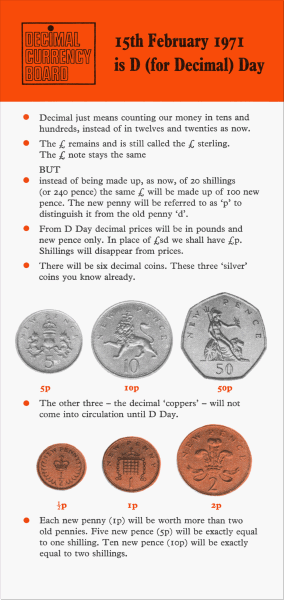 A single day was set for the switch to decimal currency. 15 February 1971 became known as Decimal Day, or D-Day. On this day the nation would switch from pounds, shillings and pence to pounds and new pence. However, the equivalence of certain old and new currency coins allowed for a more gradual switch over than might have been thought possible at first sight.