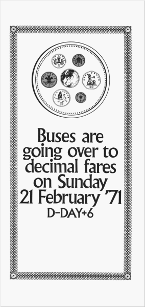 Although D-Day was 15 February 1971, and the new decimal coins became legal tender on that date, bus operators were asked to remain a “£sd shop” until 21 February 1971 (D-Day + 6). This was to alleviate the possibility of a shortage of the new coins for change-giving, if they had made the switch to decimal on D-Day.
