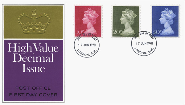 High value decimal currency definitive stamps were issued on 17 June 1970, 8 months before D-Day. This allowed stocks of pre-decimal high value stamps to be utilised as completely as possible before decimal day.