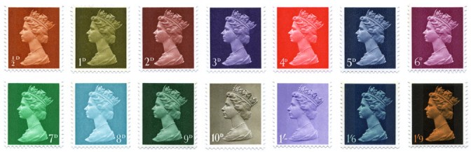 In 1967, the main definitive series of stamps was redesigned to incorporate an updated sculpted profile of the Queen. The same profile, by Arnold Machin, was also subsequently used on the UK’s first decimal coins.