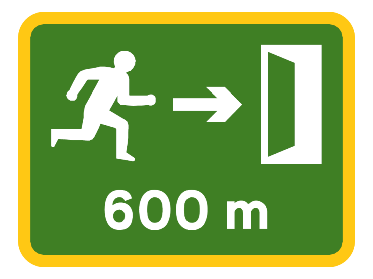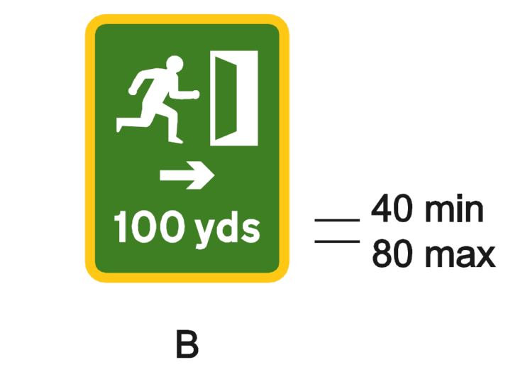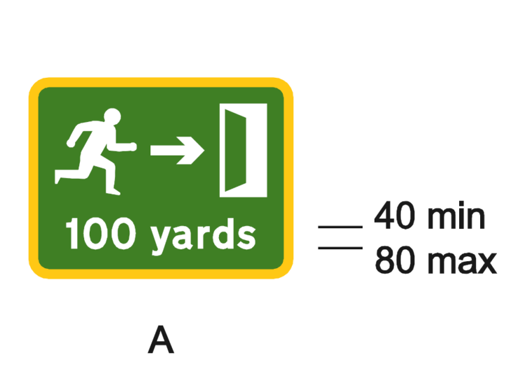 The Traffic Signs Regulations and General Directions (TSRGD) stipulates that the distances shown on emergency exit signs should be in one of two formats:
