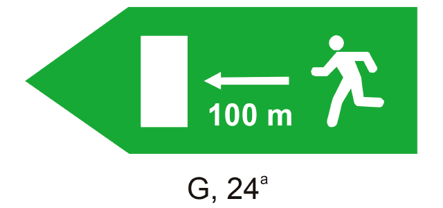 | The signs G, 24a, G, 24b and G, 24c are examples of signs to indicate the direction and distance of the nearest emergency exits. In tunnels, they shall be placed at a maximum distance of 50 m apart and at a height of 1 to 1.5 m on the sidewalls. | ||||
