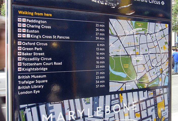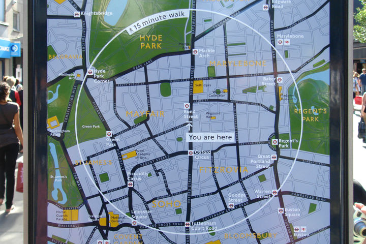 By 2008, Legible London’s new signage system had been installed in many prominent places in central London. The enamelled monolith-style signs feature maps with distance scales in the form of circles. The circumference of the circle labelled ‘5 minute walk’ passes through all the points on the map that are a distance of 5 minutes walk, as the crow flies, from the point marked, ‘You are here’.