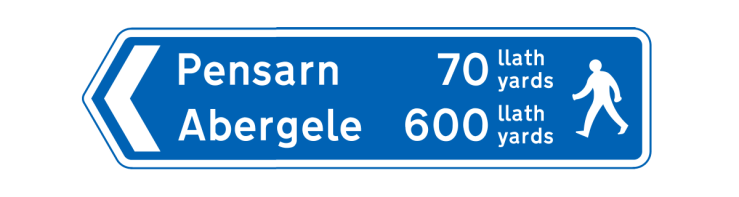 Inconsistent unit names – In Wales, due to the lack of a standard language-independent symbol for ‘yard’, pedestrian signs showing distances in yards are required to be expressed in both Welsh and English. This is done by halving the text size of the two unit name variants so that they can both fit into the same space as a single unit name.